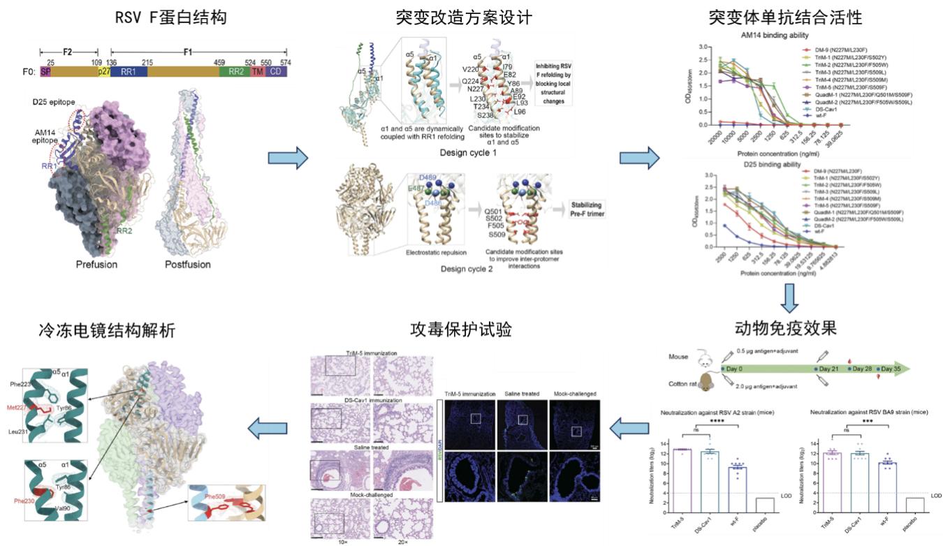 利用计算结构生物学技术,对RSV F蛋白结构和动力学性质的分析,提出了基于变构调控机制的prefusion构象稳定性突变改造新策略,成功将F蛋白稳定到prefusion构象状态。所设计的突变体蛋白在动物体内显示出良好的中和活性和攻毒保护效果,冷冻电镜结构解析验证了其呈现典型的prefusion结构。相关创新成果RSV疫苗已完成临床前研究并pre-IND沟通申请,相关结果以独家完成单位发表于Science期刊(2024, 385:1484-1491)。