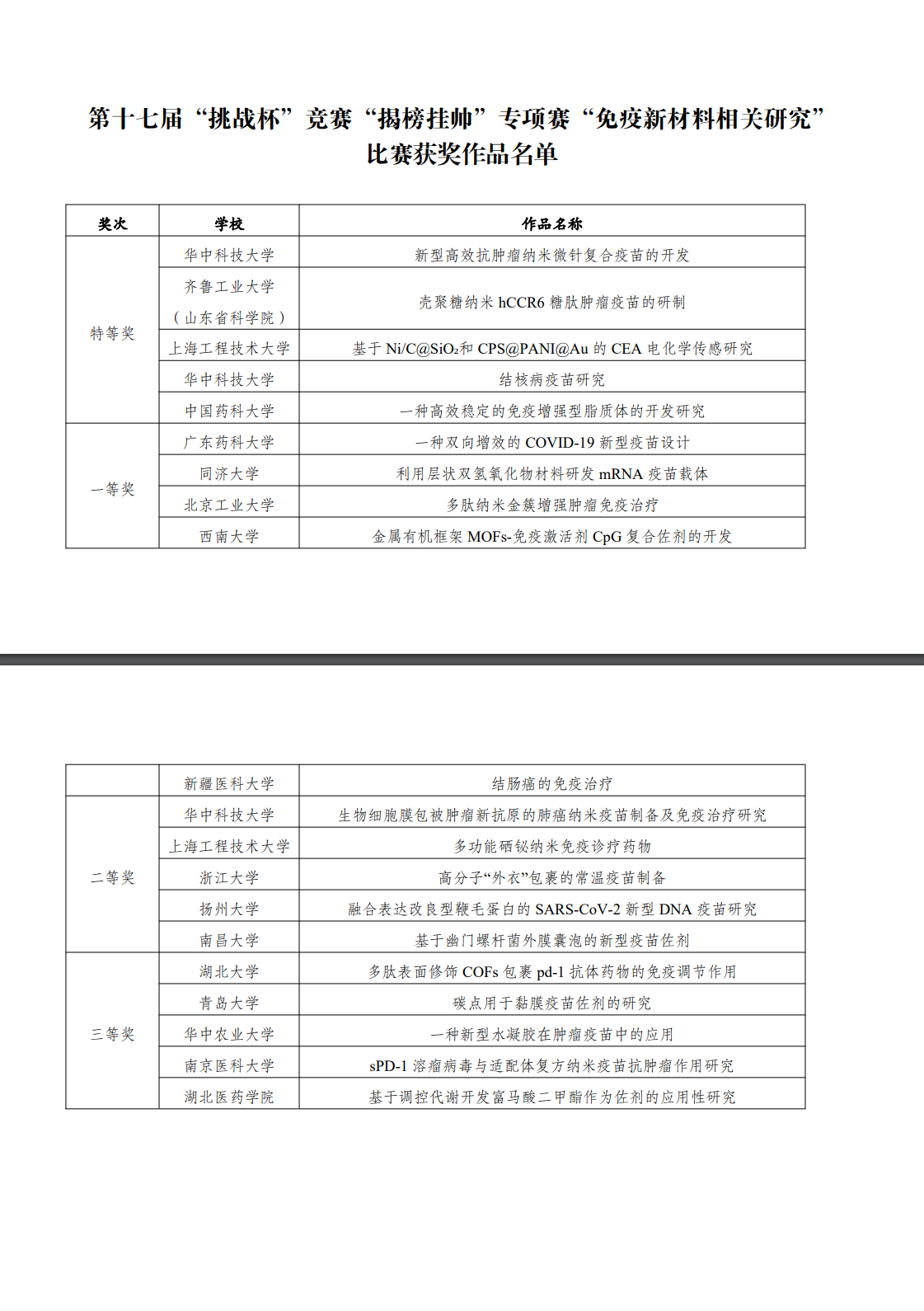 由国药中生生物技术研究院有限公司(新型疫苗国家工程研究中心)组织的第十七届“挑战杯”竞赛“揭榜挂帅”专项赛“免疫新材料相关研究”比赛,经该选题评审委员会资格审查、初审、复审,确定20件作品获得特、一、二、三等奖(各5件)。现公布获奖作品名单