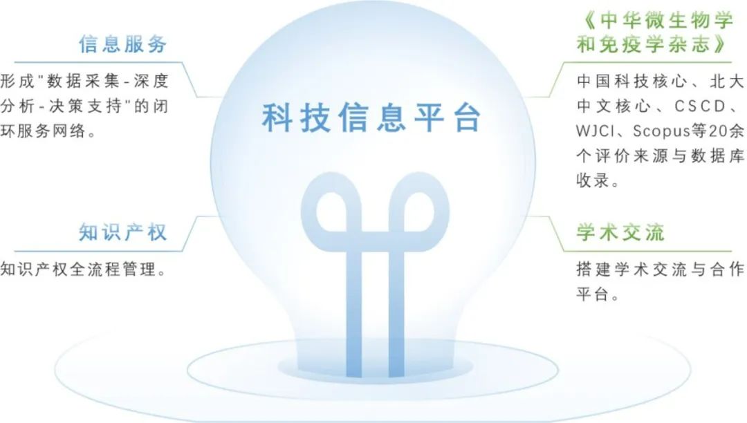 科技信息平台致力于通过信息资源整合 与共享机制,促进不同学科与不同领域之间的学术交流与合作,为科研人员提供更为广阔的视野,也为科研项目的立项、研发和推广提供科学依据和决策支持。目前,平台汇聚了丰富多元的信息资源,包括药智网、丁香园Insight、Incopat专利库、中国知网、外文医学信息资源检索平台、中华医学期刊等权威数据库。已建立“数据采集-深度分析-决策支持”的闭环服务网络,不仅能提供专业的行业信息服务,助力知识产权管理与风险控制,并通过承办高质量学术期刊--《中华微生物学和免疫学杂志》,为生物医药创新提供坚实信息基座。