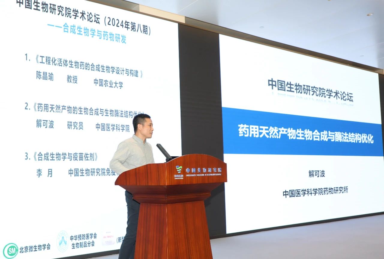 天然产物是新药研发的重要源泉,但面临资源匮乏、成药性不足等瓶颈问题,而合成生物学的发展为解决该问题提供了新思路。解可波研究员是国家优秀青年基金的获得者,研究方向聚焦于药用天然产物的生物合成,先后主持参与了国家自然科学基金、国家重点研发计划、重大新药创制等多项国家级科研项目。本次论坛中,解可波研究员以《药用天然产物的生物合成与生物酶法结构优化》为题,详细介绍了近年来其研究团队开展的紧缺药用分子的生物合成途径解析、重建、高效生物合成以及生物酶法结构修饰优化等系列工作,目前其研究团队已使用该技术成功推动多种具有显著优势的候选药物进入临床前研究。