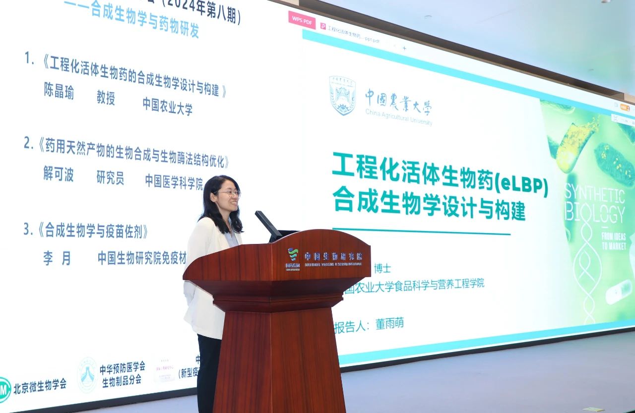 活体生物药(LBP)是人为设计和开发用于治疗、治愈或预防人类疾病或病症的活生物体,由工程化微生物组成的新一类活体生物药已经成为疾病治疗的未来趋势之一。中国农业大学陈晶瑜教授主要从事应用微生物学与合成生物学研究,在LBP与微生物递送载体开发方面有多年的工作积累,已主持国家级科研项目3项、省部级科研项目7项。来自陈晶瑜课题组的董雨萌博士在报告中以《工程化活体生物药的合成生物学设计与构建》为题,介绍了LBP的发展历史、国内外相应的法规和研究进展,同时重点介绍了工程化活体生物药(eLBP)的设计策略以及所在研究团队在eLBP开发应用中的进展。