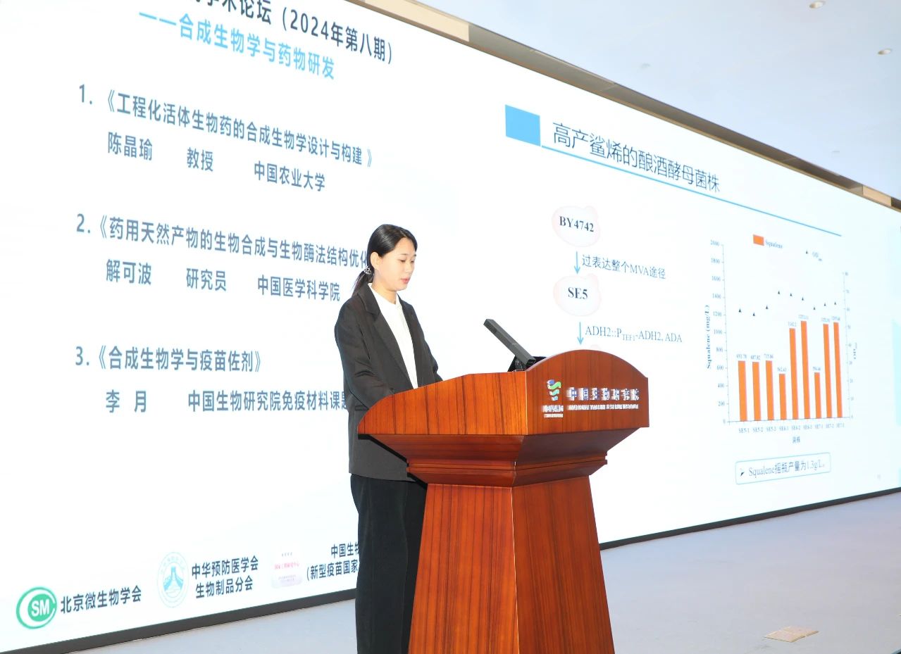 研究院新材料科学中心的免疫材料课题组(二)自2022年成立以来,基于现有免疫材料创新性和可及性不足的问题,系统地开展了包括新材料的筛选、获取、优化以及应用等研究,目前已发现多种具有良好佐剂活性的候选物并获多项专利授权。本次论坛上,来自该课题组的李月以《合成生物学与疫苗佐剂》为题分享了已上市佐剂所使用的各类材料存在的问题,以及目前国内外使用合成生物学技术生产疫苗佐剂材料的一些实例,重点介绍了研究院使用合成生物学技术生产佐剂材料的进展。
